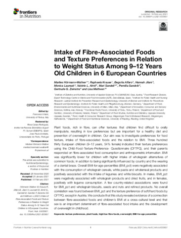 Hörmann-Wallner, M., Krause, R., Alfaro, B., Jilani, H., Laureati, M., Almli, V. L., Sandell, M., Sandvik, P., Zeinstra, G. G. and Methven, L. (2021) Intake of fibre-associated foods and texture preferences in relation to weight status among 9–12 years old children in 6 European countries. Frontiers in Nutrition, 8. 35. ISSN 2296-861X doi: 10.3389/fnut.2021.633807