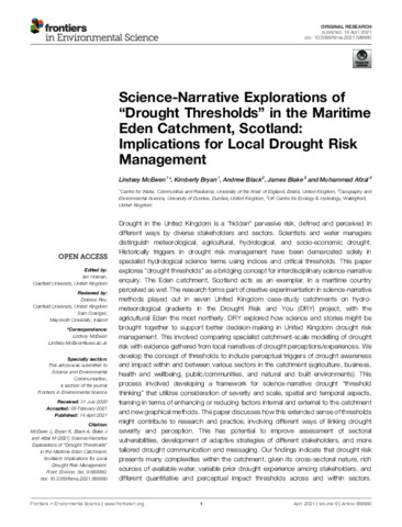 McEwen, L. J., Bryan, K., Black, A., Blake, J. and Afzal, M. (2021) Science-narrative explorations of 'drought thresholds' in the maritime Eden catchment, Scotland: implications for local drought risk management. Frontiers in Environmental Science, 9. 589980. ISSN 2296-665X doi: 10.3389/fenvs.2021.589980