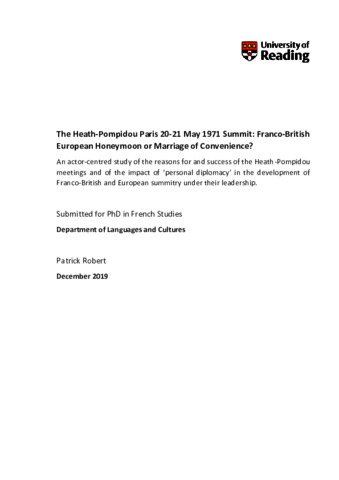 Robert, P. (2020) The Heath-Pompidou Paris 20-21 May 1971 summit: Franco-British European honeymoon or marriage of convenience? An actor-centred study of the reasons for and success of the Heath-Pompidou meetings and of the impact of ‘personal diplomacy’ in the development of Franco-British and European summitry under their leadership. PhD thesis, University of Reading. doi: 10.48683/1926.00096823