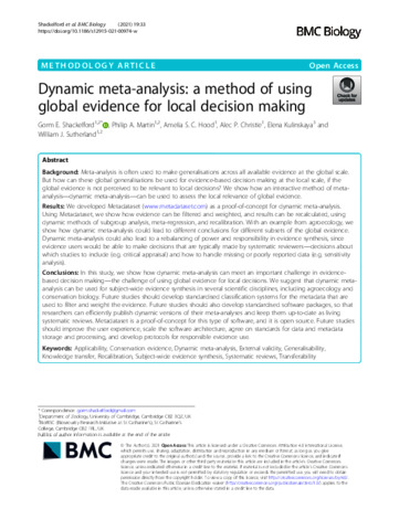 Shackelford, G. E., Martin, P. A., Hood, A. S. C. orcid id iconORCID: https://orcid.org/0000-0003-3803-0603, Christie, A. P., Kulinskaya, E. and Sutherland, W. J. (2021) Dynamic meta-analysis: a method of using global evidence for local decision making. BMC Biology, 19 (1). 33. ISSN 1741-7007 doi: 10.1186/s12915-021-00974-w