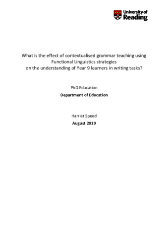 Speed, H. (2020) What is the effect of contextualised grammar teaching using Functional Linguistics strategies on the understanding of Year 9 learners in writing tasks? PhD thesis, University of Reading. doi: 10.48683/1926.00097046