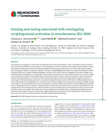 The presence of a change in a visual scene can influence brain activity and behaviour, even in the absence of full conscious report. It may be possible for us to sense that such a change has occurred, even if we cannot specify exactly where or what it was. Despite existing evidence from electroencephalogram (EEG) and eye-tracking data, it is still unclear how this partial level of awareness relates to fMRI BOLD activation. Using EEG, functional magnetic resonance imaging (fMRI), and a change blindness paradigm, we found multi-modal evidence to suggest that sensing a change is distinguishable from being blind to it. Specifically, trials during which participants could detect the pres- ence of a colour change but not identify the location of the change (sense trials), were compared to those where participants could both detect and localise the change (localise or see trials), as well as change blind trials. In EEG, late parietal positivity and N2 amplitudes were larger for localised changes only, when compared to change blindness. However, ERP-informed fMRI analysis found no voxels with activation that significantly co-varied with fluctuations in single-trial late positivity amplitudes. In fMRI, a range of visual (BA17,18), parietal (BA7,40), and midbrain (anterior cingulate, BA24) areas showed increased fMRI BOLD activation when a change was sensed, compared to change blindness. These visual and parietal areas are commonly implicated as the storage sites of visual working memory, and we therefore argue that sensing may not be explained by a lack of stored representation of the visual display. Both seeing and sensing a change were associated with an overlapping occipitoparietal network of activation when compared to blind trials, suggesting that the quality of the visual representation, rather than the lack of one, may result in partial awareness during the change blindness paradigm. Keywords: EEG-fMRI, change blindness, sensing, conscious awareness