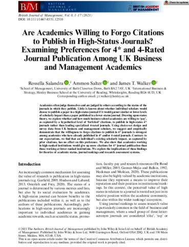 Academics often judge themselves and are judged by others according to the status of the journals in which they publish. Little is known about whether individual scholars would choose to publish an article in a high-status journal if it would garner similar or lower levels of scholarly impact than an article published in a lower-status journal. Drawing upon status theory, we explore whether and how much business school academics are willing to ‘pay’, as captured by a hypothetical level of ‘forfeited’ citations, to publish in high-status 4* journals rather than leading specialized 4-rated journals. Using choice-set design and survey data from UK business and management scholars, we suggest and empirically demonstrate that the willingness to forgo citations to publish in 4* journals is strongest among academics who have already published in 4* and/or 4-rated journals. Contrary to our expectations, we find that an individual’s existing scholarly impact, as captured by prior citations, has no effect on this preference. We also show that academics working in high-ranked institutions would give up more citations for 4* journal publication than those working at lower-ranked institutions. We explore the implications of these findings for theories of academic status, journal rankings and research assessment systems.