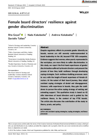 Despite regulatory efforts to promote gender diversity on boards, women are still severely underrepresented in board leadership in the UK, beyond FTSE 100 companies. Evidence suggests that women, when poorly represented inthe workplace, are more likely to suffer discrimination. In this study we report the first‐hand experiences of gender discrimination suffered by female directors and present the process of how they build resilience through developing coping strategies. Such resilience‐building processes seem to vary with the length of board experience of female directors. At the outset of their board journey, they adopt avoidant coping strategies of denial and disengagement. However, with experience in boards, they gain the confidence to pursue the active coping strategy of seeking and extending support. This qualitative study is based on 42 elite interviews of board Directors and is guided by the resilience theory, in the context of top FTSE boards. The article also discusses the contribution of the study to theory, praxis and policy.