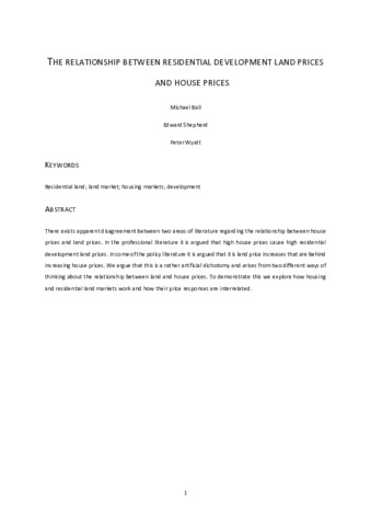 Ball, M., Shepherd, E. and Wyatt, P. orcid id iconORCID: https://orcid.org/0000-0002-9091-2729 (2022) The relationship between residential development land prices and house prices. Town Planning Review, 93 (4). pp. 401-421. ISSN 1478-341X doi: 10.3828/tpr.2021.27