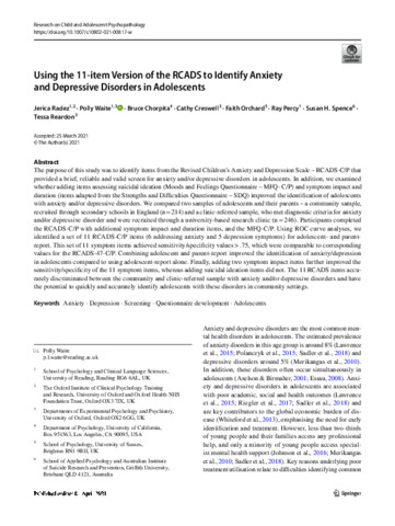 Radez, J., Waite, P. orcid id iconORCID: https://orcid.org/0000-0002-1967-8028, Chorpita, B., Creswell, C., Orchard, F., Percy, R., Spence, S. H. and Reardon, T. (2021) Using the 11-item version of the RCADS to identify anxiety and depressive disorders in adolescents. Research on Child and Adolescent Psychopathology, 49. pp. 1241-1257. ISSN 2730-7166 doi: 10.1007/s10802-021-00817-w