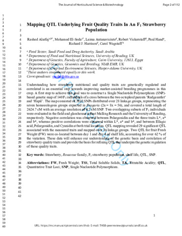 Alarfaj, R., El-Soda, M., Antanaviciute, L., Vickerstaff, R., Hand, P., Harrison, R. J. and Wagstaff, C. orcid id iconORCID: https://orcid.org/0000-0001-9400-8641 (2021) Mapping QTL underlying fruit quality traits in an F1 strawberry population. Journal of Horticultural Science & Biotechnology, 96 (5). pp. 634-645. ISSN 1462-0316 doi: 10.1080/14620316.2021.1912647