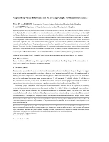 Markchom, T. and Liang, H. (2021) Augmenting visual information in knowledge graphs for recommendations. In: ACM International Conference on Intelligent User Interfaces, 13-17 April 2021, Texas. doi: 10.1145/3397481.3450686