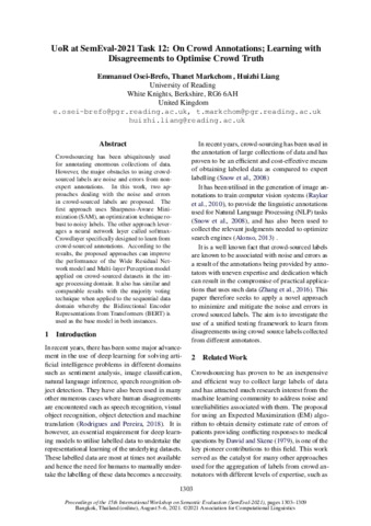 Osei-Brefo, E., Markchom, T. and Liang, H. (2021) UoR at SemEval-2021 task 12: on crowd annotations: learning with disagreements to optimise crowd truth. In: SemEval-2021, 5-6 August 2021, Bangkok.
