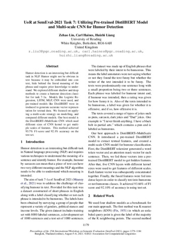 Liu, Z., Haines, C. and Liang, H. (2021) UoR at SemEval-2021 task 7: utilizing pre-trained DistilBert model and multi-scale CNN for humor detection. In: SemEval-2021, 5-6 August 2021, Bangkok.
