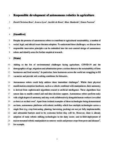 Rose, D., Lyon, J., de Boon, A., Hanheide, M. and Pearson, S. (2021) Responsible development of autonomous robotics in agriculture. Nature Food, 2 (5). pp. 306-309. ISSN 2662-1355 doi: 10.1038/s43016-021-00287-9