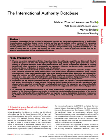 Zuern, M., Tokhi, A. and Binder, M. orcid id iconORCID: https://orcid.org/0000-0002-9144-3979 (2021) The international authority database. Global Policy, 12 (4). pp. 430-442. ISSN 1758-5899 doi: 10.1111/1758-5899.12971