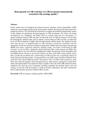 Extant studies have investigated the relation between corporate social responsibility (CSR) endeavours and earnings quality based on monotonic models, showing mixed and inconclusive empirical evidence. By identifying heterogeneity in CSR investments, we extend prior literature to explore the potentially nonmonotonic nature of this relation. Specifically, we classify firms into two sub-groups, entities underinvesting and overinvesting in CSR activities, in which the levels of CSR investments are lower and higher than the theoretically optimal point respectively. Our empirical results show that the level of CSR underinvestment is positively associated with the magnitude of both accrual-based earnings management (AEM) and real earnings management (REM) and, hence, negatively related to earnings quality. For firms overinvesting in CSR activities, we do not find a significant relation between CSR overinvestment and AEM. The empirical analyses for real activities manipulation exhibit inconsistent results throughout our four REM proxies. However, the mixed evidence for firms with CSR overinvestment cannot fully exclude the possibility that overinvesting in CSR activities has a significant impact on future financial reporting quality. Varying incentives for CSR overinvestment in different firms could drive the inconsistent results. The positive effect of CSR overinvestment by some firms may offset the negative effect brought about by other entities, making the overall effect minor and unnoticeable. Our empirical results, together with some other CSR-related research, emphasise the need for more transparent reporting regarding the detailed nature, aim, and strategy of relevant CSR investments to help investing communities and other constituents better understand the incentives behind CSR activities.