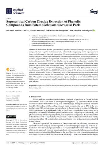 de Andrade Lima, M., Andreou, R., Charalampopoulos, D. orcid id iconORCID: https://orcid.org/0000-0003-1269-8402 and Chatzifragkou, A. orcid id iconORCID: https://orcid.org/0000-0002-9255-7871 (2021) Supercritical carbon dioxide extraction of phenolic compounds from potato (Solanum tuberosum) peels. Applied Sciences, 11 (8). 3410. ISSN 2076-3417 doi: 10.3390/app11083410