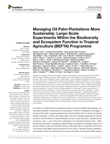 Luke, S. H., Advento, A. D., Agung Ketut Aryawan, A., Nugroho Adhy, D., Ashton-Butt, A., Barclay, H., Prajna Dewi, J., Drewer, J., Dumbrell, A. J., Eycott, A. E., Harianja, M. F., Hinsch, J. K., Hood, A. S. C. orcid id iconORCID: https://orcid.org/0000-0003-3803-0603, Kurniawan, C., Kurz, D. J., Mann, D. J., Matthews Nicholass, K. J., Naim, M., Pashkevich, M. D., Prescott, G. W., Ps, S., Purnomo, D., Purwoko, R. R., Putra, S., Rambe, T. D. S., Spear, D. M., Tan, D. J. X., Tao, H.-H., Tarigan, R. S., Wahyuningsih, R., Waters, H. S., Harto Widodo, R., Woodham, C. R., Caliman, J.-P., Slade, E. M., Snaddon, J. L., Foster, W. A. and Turner, E. C. (2020) Managing oil palm plantations more sustainably: large-scale experiments within the biodiversity and ecosystem function in tropical agriculture (BEFTA) programme. Frontiers in Forests and Global Change, 2 (75). ISSN 2624-893X doi: 10.3389/ffgc.2019.00075