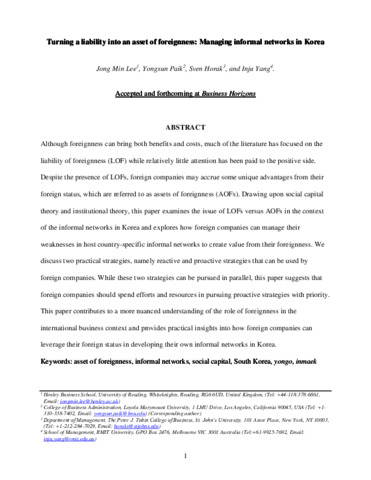 Lee, J. M., Paik, Y., Horak, S. and Yang, I. (2022) Turning a liability into an asset of foreignness: managing informal networks in Korea. Business Horizons, 65 (3). pp. 351-364. ISSN 0007-6813 doi: 10.1016/j.bushor.2021.04.002