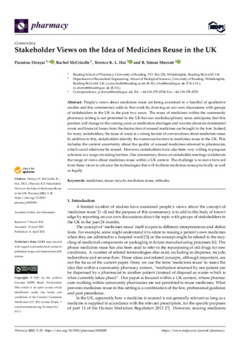 Abstract: People’s views about medicines reuse are being examined in a handful of qualitative studies and this commentary adds to that work by drawing on our own discussions with groups of stakeholders in the UK in the past two years. The reuse of medicines within the community pharmacy setting is not permitted in the UK but our multidisciplinary team anticipates that this position will change in the coming years as medication shortages and worries about environ-mental waste and financial losses from the destruction of unused medicines are brought to the fore. Indeed, for many stakeholders, the issue of waste is a strong feature of conversations about medicines reuse. In addition to this, stakeholders identify the numerous barriers to medicines re-use in the UK. This includes the current uncertainty about the quality of unused medicines re-turned to pharmacies, which could otherwise be reused. However, stakeholders have also been very willing to propose solutions to a range of existing barriers. Our commentary draws on stakeholder meetings to elaborate the range of views about medicines reuse within a UK context. The challenge is to move forward from these views to advance the technologies that will facilitate medicines reuse practically as well as legally.