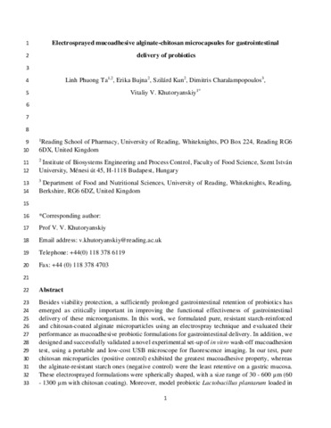 Ta, L. P., Bujna, E., Kun, S., Charalampopoulos, D. orcid id iconORCID: https://orcid.org/0000-0003-1269-8402 and Khutoryanskiy, V. V. orcid id iconORCID: https://orcid.org/0000-0002-7221-2630 (2021) Electrosprayed mucoadhesive alginate-chitosan microcapsules for gastrointestinal delivery of probiotics. International Journal of Pharmaceutics, 597. 120342. ISSN 0378-5173 doi: 10.1016/j.ijpharm.2021.120342