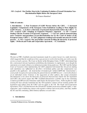 Hamilton, F. orcid id iconORCID: https://orcid.org/0000-0002-3638-913X (2021) NH v Lenford: one further step in the continuing evolution of sexual orientation non-discrimination rights before the European Union. GenIUS. ISSN 2384-9495