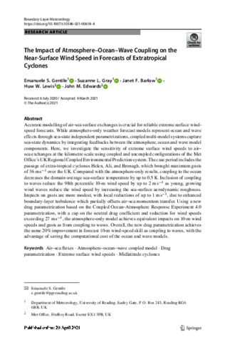 Gentile, E. S. orcid id iconORCID: https://orcid.org/0000-0002-6878-5145, Gray, S. L. orcid id iconORCID: https://orcid.org/0000-0001-8658-362X, Barlow, J. F. orcid id iconORCID: https://orcid.org/0000-0002-9022-6833, Lewis, H. W. orcid id iconORCID: https://orcid.org/0000-0003-3581-6459 and Edwards, J. M. orcid id iconORCID: https://orcid.org/0000-0001-5784-3218 (2021) The impact of atmosphere–ocean–wave coupling on the near-surface wind speed in forecasts of extratropical cyclones. Boundary-Layer Meteorology, 180. pp. 105-129. ISSN 0006-8314 doi: 10.1007/s10546-021-00614-4