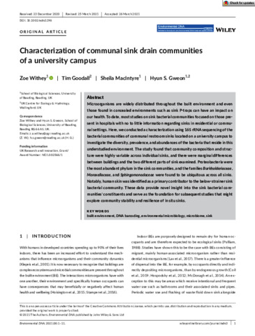 Withey, Z., Goodall, T., MacIntyre, S. and Gweon, S. orcid id iconORCID: https://orcid.org/0000-0002-6218-6301 (2021) Characterization of communal sink drain communities of a university campus. Environmental DNA, 3 (5). ISSN 2637-4943 doi: 10.1002/edn3.196