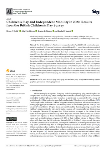 Dodd, H. F. orcid id iconORCID: https://orcid.org/0000-0003-1446-5338, Fitzgibbon, L. orcid id iconORCID: https://orcid.org/0000-0002-8563-391X, Watson, B. E. orcid id iconORCID: https://orcid.org/0000-0001-7540-3187 and Nesbit, R. J. (2021) Children’s play and independent mobility in 2020: results from the British Children’s Play Survey. International Journal of Environmental Research and Public Health, 18 (8). 4334. ISSN 1660-4601 doi: 10.3390/ijerph18084334