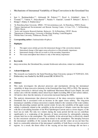Bashmachnikov, I. L., Fedorov, A. M., Golubkin, P. A., Vesman, A. V., Selyuzhenok, V. V., Gnatiuk, N. V., Gnatiuk, L. P., Hodges, K. I. orcid id iconORCID: https://orcid.org/0000-0003-0894-229X and Dukhovskoy, D. S. (2021) Mechanisms of interannual variability of deep convection in the Greenland Sea. Deep Sea Research Part I: Oceanographic Research Papers, 174. 103557. ISSN 0967-0637 doi: 10.1016/j.dsr.2021.103557