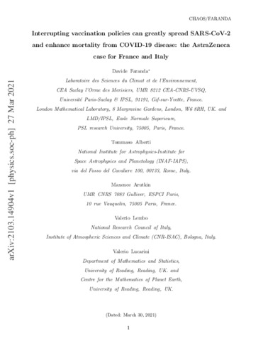 Faranda, D., Alberti, T., Arutkin, M., Lembo, V. and Lucarini, V. orcid id iconORCID: https://orcid.org/0000-0001-9392-1471 (2021) Interrupting vaccination policies can greatly spread SARS-CoV-2 and enhance mortality from COVID-19 disease: the AstraZeneca case for France and Italy. Chaos: An Interdisciplinary Journal of Nonlinear Science, 31 (4). 041105. ISSN 1089-7682 doi: 10.1063/5.0050887