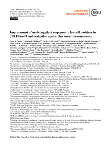 Harper, A. B., Williams, K. E., McGuire, P. orcid id iconORCID: https://orcid.org/0000-0001-6592-4966, Duran Rojas, M. C., Hemming, D., Verhoef, A. orcid id iconORCID: https://orcid.org/0000-0002-9498-6696, Huntingford, C., Rowland, L., Marthews, T., Eller, C. B., Mathison, C., Nobrega, R., Gedney, N., Vidale, P. L. orcid id iconORCID: https://orcid.org/0000-0002-1800-8460, Otu-Larbi, F., Panday, D., Garrigues, S., Wright, A., Slevin, D., De Kauwe, M. G., Blyth, E., Ardö, J., Black, A., Bonal, D., Buchmann, N., Burban, B., Fuchs, K., de Grandcourt, A., Mammarella, I., Merbold, L., Montagnani, L., Nouvellon, Y., Restrepo-Coupe, N. and Wohlfahrt, G. (2021) Improvement of modelling plant responses to low soil moisture in JULESvn4.9 and evaluation against flux tower measurements. Geoscientific Model Development, 14 (6). pp. 3269-3294. ISSN 1991-9603 doi: 10.5194/gmd-2020-273