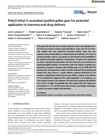 Poly(2‐ethyl‐2‐oxazoline) grafted gellan gum for potential application in transmucosal drug delivery.