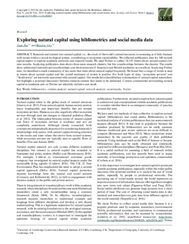 Research and interest into natural capital, i.e., the stock of the world’s natural resources, is increasing as it links humans with nature within a social-ecological system, contributing to ecosystem sustainability. We collected publication data for 300 natural capital papers to explore academic networks and research trends. We used Twitter to collect 14,193 tweets about natural capital over nine months. Analyzing publication data shows three main research clusters, but few coauthorships between the clusters. The results show substantial international coauthorships, and the dominance of American and British academics as coauthors. Analyzing Twitter data, we identified a small community of key users that tweet about natural capital frequently. We found that a range of words is used in tweets about natural capital and the overall sentiment of tweets is positive. For both types of data, “ecosystem services” and “biodiversity” are keywords associated with natural capital. Our results have identified key communities of natural capital researchers, but highlight a potential disconnect between research clusters that needs to be addressed. Current communities surrounding natural capital in academia and on Twitter are relatively exclusive and small.