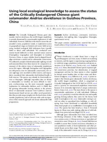 Using local ecological knowledge to assess the status of the Critically Endangered Chinese giant salamander Andrias davidianus in Guizhou Province, China.