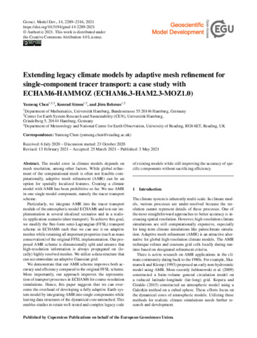 Chen, Y. orcid id iconORCID: https://orcid.org/0000-0002-2319-6937, Simon, K. and Behrens, J. (2021) Extending legacy climate models by adaptive mesh refinement for single-component tracer transport: a case study with ECHAM6-HAMMOZ (ECHAM6.3-HAM2.3-MOZ1.0). Geoscientific Model Development, 14 (5). pp. 2289-2316. ISSN 1991-9603 doi: 10.5194/gmd-14-2289-2021