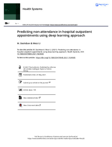 Dashtban, M. and Li, W. orcid id iconORCID: https://orcid.org/0000-0003-2878-3185 (2022) Predicting non-attendance in hospital outpatient appointments using Deep Learning Approach. Health Systems, 11 (3). pp. 189-210. ISSN 2047-6965 doi: 10.1080/20476965.2021.1924085