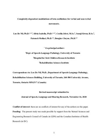De Nil, L., Isabella, S., Jobst, C., Kwon, S., Mollaei, F. orcid id iconORCID: https://orcid.org/0000-0003-2916-9750 and Cheyne, D. (2021) Complexity-dependent modulations of beta oscillations for verbal and nonverbal movements. Journal of Speech, Language and Hearing Research, 64 (6S). pp. 2248-2260. ISSN 1558-9102 doi: 10.1044/2021_JSLHR-20-00275