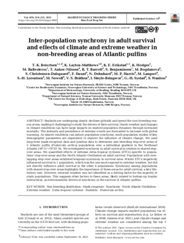 Inter-population synchrony in adult survival and effects of climate and extreme weather in non-breeding areas of Atlantic puffins.