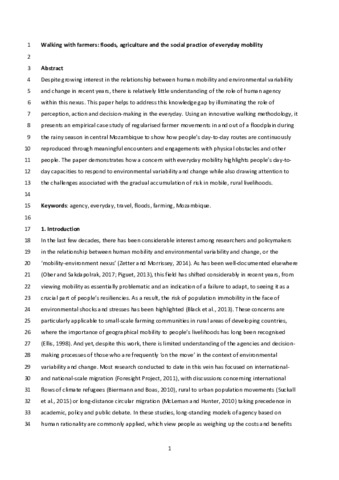 Despite growing interest in the relationship between human mobility and environmental variability and change in recent years, there is relatively little understanding of the role of human agency within this nexus. This paper helps to address this knowledge gap by illuminating the role of perception, action and decision-making in the everyday. Using an innovative walking methodology, it presents an empirical case study of regularised farmer movements in and out of a floodplain during the rainy season in central Mozambique to show how people’s day-to-day routes are continuously reproduced through meaningful encounters and engagements with physical obstacles and other people. The paper demonstrates how a concern with everyday mobility highlights people’s day-to-day capacities to respond to environmental variability and change while also drawing attention to the challenges associated with the gradual accumulation of risk in mobile, rural livelihoods.