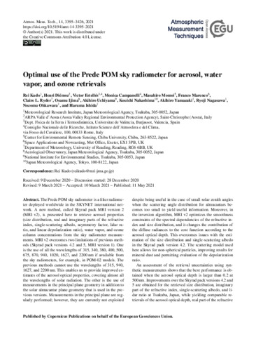 Kudo, R., Diemoz, H., Estellés, V., Campanelli, M., Momoi, M., Marenco, F., Ryder, C. L. orcid id iconORCID: https://orcid.org/0000-0002-9892-6113, Ijima, O., Uchiyama, A., Nakashima, K., Yamazaki, A., Nagasawa, R., Ohkawara, N. and Ishida, H. (2021) Optimal use of the Prede POM sky radiometer for aerosol, water vapor, and ozone retrievals. Atmospheric Measurement Techniques, 14 (5). pp. 3395-3426. ISSN 1867-8548 doi: 10.5194/amt-14-3395-2021