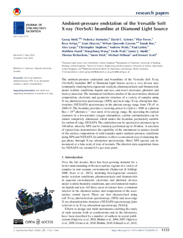 The ambient-pressure endstation and branchline of the Versatile Soft X-ray (VerSoX) beamline B07 at Diamond Light Source serves a very diverse user community studying heterogeneous catalysts, pharmaceuticals and biomaterials under realistic conditions, liquids and ices, and novel electronic, photonic and battery materials. The instrument facilitates studies of the near-surface chemical composition, electronic and geometric structure of a variety of samples using X-ray photoelectron spectroscopy (XPS) and near-edge X-ray absorption fine-structure (NEXAFS) spectroscopy in the photon energy range from 170 eV to 2800 eV. The beamline provides a resolving power hν/Δ(hν) > 5000 at a photon flux > 1010 photons s−1 over most of its energy range. By operating the optical elements in a low-pressure oxygen atmosphere, carbon contamination can be almost completely eliminated, which makes the beamline particularly suitable for carbon K-edge NEXAFS. The endstation can be operated at pressures up to 100 mbar, whereby XPS can be routinely performed up to 30 mbar. A selection of typical data demonstrates the capability of the instrument to analyse details of the surface composition of solid samples under ambient-pressure conditions using XPS and NEXAFS. In addition, it offers a convenient way of analysing the gas phase through X-ray absorption spectroscopy. Short XPS spectra can be measured at a time scale of tens of seconds. The shortest data acquisition times for NEXAFS are around 0.5 s per data point.