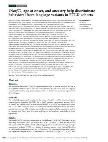 C9orf72, age at onset, and ancestry help discriminate behavioral from language variants in FTLD cohorts.