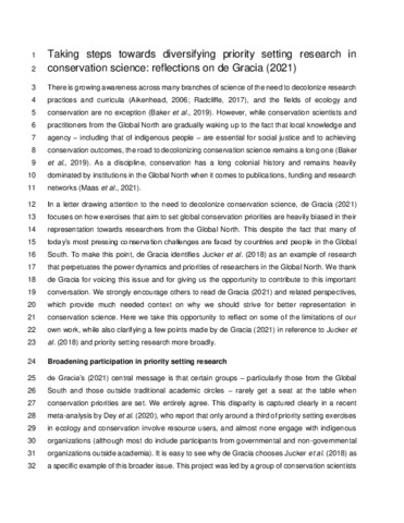 Jucker, T., Amano, T., Bell, A., Garnett, E.E., Geffert, J.L., Guth, M.K., Hacket-Pain, A., Luke, S.H., Mumby, H.S., Nunes, M., Rademacher, T., Rose, D., Scheichler, J., Simmons, B.I., Zabala, A. and Mukherjee, N. (2021) Steps towards diversifying priority setting research in conservation science: reflections on de Gracia 2021. Conservation Biology, 35 (4). pp. 1324-1326. ISSN 1523-1739 doi: 10.1111/cobi.13790