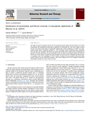 Mertens, G. and Morriss, J. (2021) Intolerance of uncertainty and threat reversal: a conceptual replication of Morriss et al. (2019). Behaviour Research and Therapy, 137. 103799. ISSN 0005-7967 doi: 10.1016/j.brat.2020.103799