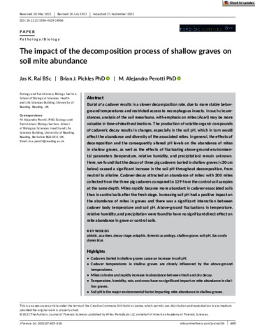 Rai, J. K., Pickles, B. J. orcid id iconORCID: https://orcid.org/0000-0002-9809-6455 and Perotti, M. A. orcid id iconORCID: https://orcid.org/0000-0002-3769-7126 (2022) The impact of the decomposition process of shallow graves on soil mite abundance. Journal of Forensic Sciences, 67 (2). pp. 605-618. ISSN 0022-1198 doi: 10.1111/1556-4029.14906