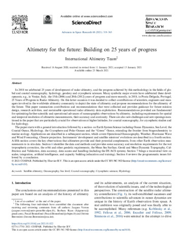 In 2018 we celebrated 25 years of development of radar altimetry, and the progress achieved by this methodology in the fields of global and coastal oceanography, hydrology, geodesy and cryospheric sciences. Many symbolic major events have celebrated these developments, e.g., in Venice, Italy, the 15th (2006) and 20th (2012) years of progress and more recently, in 2018, in Ponta Delgada, Portugal, 25 Years of Progress in Radar Altimetry. On this latter occasion it was decided to collect contributions of scientists, engineers and managers involved in the worldwide altimetry community to depict the state of altimetry and propose recommendations for the altimetry of the future. This paper summarizes contributions and recommendations that were collected and provides guidance for future mission design, research activities, and sustainable operational radar altimetry data exploitation. Recommendations provided are fundamental for optimizing further scientific and operational advances of oceanographic observations by altimetry, including requirements for spatial and temporal resolution of altimetric measurements, their accuracy and continuity. There are also new challenges and new openings mentioned in the paper that are particularly crucial for observations at higher latitudes, for coastal oceanography, for cryospheric studies and for hydrology. The paper starts with a general introduction followed by a section on Earth System Science including Ocean Dynamics, Sea Level, the Coastal Ocean, Hydrology, the Cryosphere and Polar Oceans and the “Green” Ocean, extending the frontier from biogeochemistry to marine ecology. Applications are described in a subsequent section, which covers Operational Oceanography, Weather, Hurricane Wave and Wind Forecasting, Climate projection. Instruments’ development and satellite missions’ evolutions are described in a fourth section. A fifth section covers the key observations that altimeters provide and their potential complements, from other Earth observation measurements to in situ data. Section 6 identifies the data and methods and provides some accuracy and resolution requirements for the wet tropospheric correction, the orbit and other geodetic requirements, the Mean Sea Surface, Geoid and Mean Dynamic Topography, Calibration and Validation, data accuracy, data access and handling (including the DUACS system). Section 7 brings a transversal view on scales, integration, artificial intelligence, and capacity building (education and training). Section 8 reviews the programmatic issues followed by a conclusion.