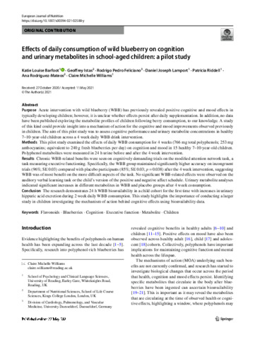 Barfoot, K. L. orcid id iconORCID: https://orcid.org/0000-0002-2866-6467, Istas, G., Feliciano, R. P., Lamport, D. J. orcid id iconORCID: https://orcid.org/0000-0002-4592-0439, Riddell, P. orcid id iconORCID: https://orcid.org/0000-0002-4916-2057, Rodriguez-Mateos, A. and Williams, C. M. orcid id iconORCID: https://orcid.org/0000-0003-4452-671X (2021) Effects of daily consumption of wild blueberry on cognition and urinary metabolites in school‑aged children: a pilot study. European Journal of Nutrition, 60. pp. 4263-4278. ISSN 1436-6215 doi: 10.1007/s00394-021-02588-y