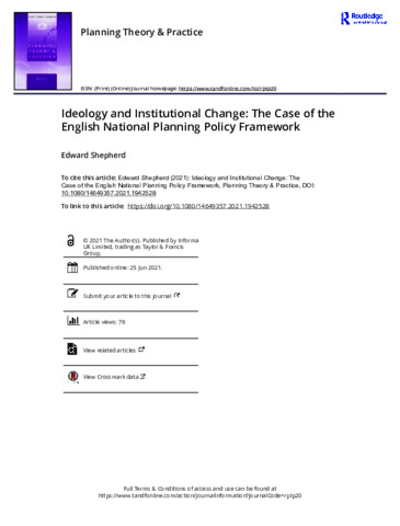 Shepherd, E. (2021) Ideology and institutional change: the case of the English National Planning Policy framework. Planning Theory and Practice, 22 (4). pp. 519-536. ISSN 1464-9357 doi: 10.1080/14649357.2021.1942528