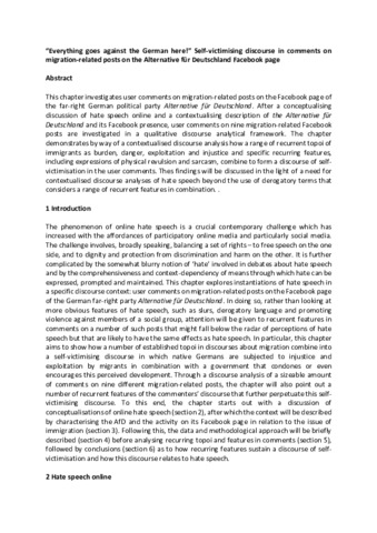 This chapter investigates user comments on migration-related posts on the Facebook page of the far-right German political party Alternative für Deutschland. After a conceptualising discussion of hate speech online and a contextualising description of the Alternative für Deutschland and its Facebook presence, user comments on nine migration-related Facebook posts are investigated in a qualitative discourse analytical framework. The chapter demonstrates by way of a contextualised discourse analysis how a range of recurrent topoi of immigrants as burden, danger, exploitation and injustice and specific recurring features, including expressions of physical revulsion and sarcasm, combine to form a discourse of self-victimisation in the user comments. Thes findings will be discussed in the light of a need for contextualised discourse analyses of hate speech beyond the use of derogatory terms that considers a range of recurrent features in combination.