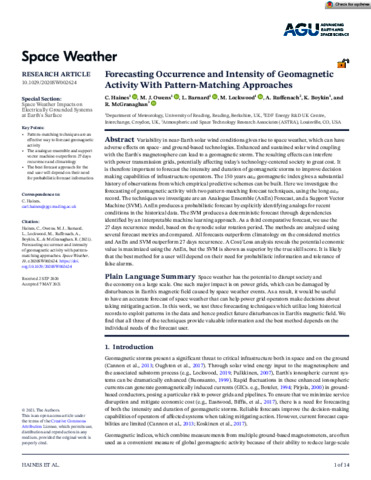Forecasting occurrence and intensity of geomagnetic activity with pattern‐matching approaches.