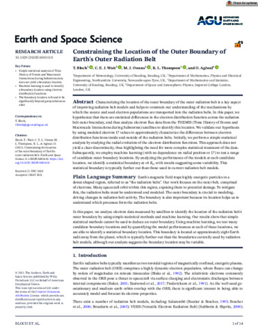 Bloch, T. orcid id iconORCID: https://orcid.org/0000-0001-6017-1619, Watt, C. E. J. orcid id iconORCID: https://orcid.org/0000-0003-3193-8993, Owens, M. J. orcid id iconORCID: https://orcid.org/0000-0003-2061-2453, Thompson, R. L. orcid id iconORCID: https://orcid.org/0000-0002-2766-0952 and Agiwal, O. orcid id iconORCID: https://orcid.org/0000-0003-3999-9926 (2021) Constraining the location of the outer boundary of Earth’s outer radiation belt. Earth and Space Science, 8 (6). ISSN 2333-5084 doi: 10.1029/2020EA001610