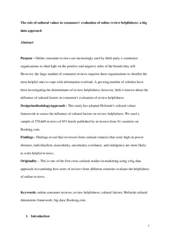 Purpose Online consumer reviews are increasingly used by third-party e-commerce organizations to shed light on the positive and negative sides of the brands they sell. However, the large number of consumer reviews requires these organizations to shortlist the most helpful ones to cope with information overload. A growing number of scholars have been investigating the determinants of review helpfulness; however, little is known about the influence of cultural factors in consumer's evaluation of review helpfulness. Design/methodology/approach This study has adopted Hofstede's cultural values framework to assess the influence of cultural factors on review helpfulness. We used a sample of 570,669 reviews of 851 hotels published by reviewers from 81 countries on Booking.com. Findings Findings reveal that reviewers from cultural contexts that score high on power distance, individualism, masculinity, uncertainty avoidance and indulgence are more likely to write helpful reviews. Originality/value This is one of the first cross-cultural studies in marketing using a big data approach in examining how users of reviews from different countries evaluate the helpfulness of online reviews.